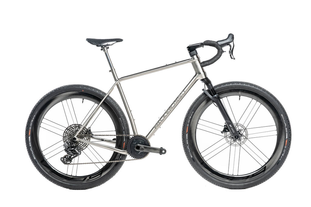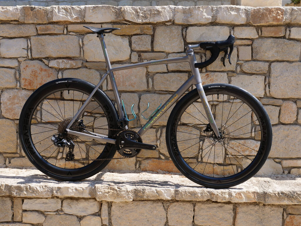 Besonders gut passt die Campagnolo Super Record Disc Gruppe zu diesem Rad. Mit seinen 28 mm Reifen ist es sowohl auf der Straße als auch auf leichten Offroad-Strecken schnell unterwegs. Neben der Standard-Ausstattung mit Syntace-Anbauteilen bieten wir auch ein Titan-Paket mit FALKENJAGD-Teilen an, einschließlich unseres eleganten Axios Light Gepäckträgers.